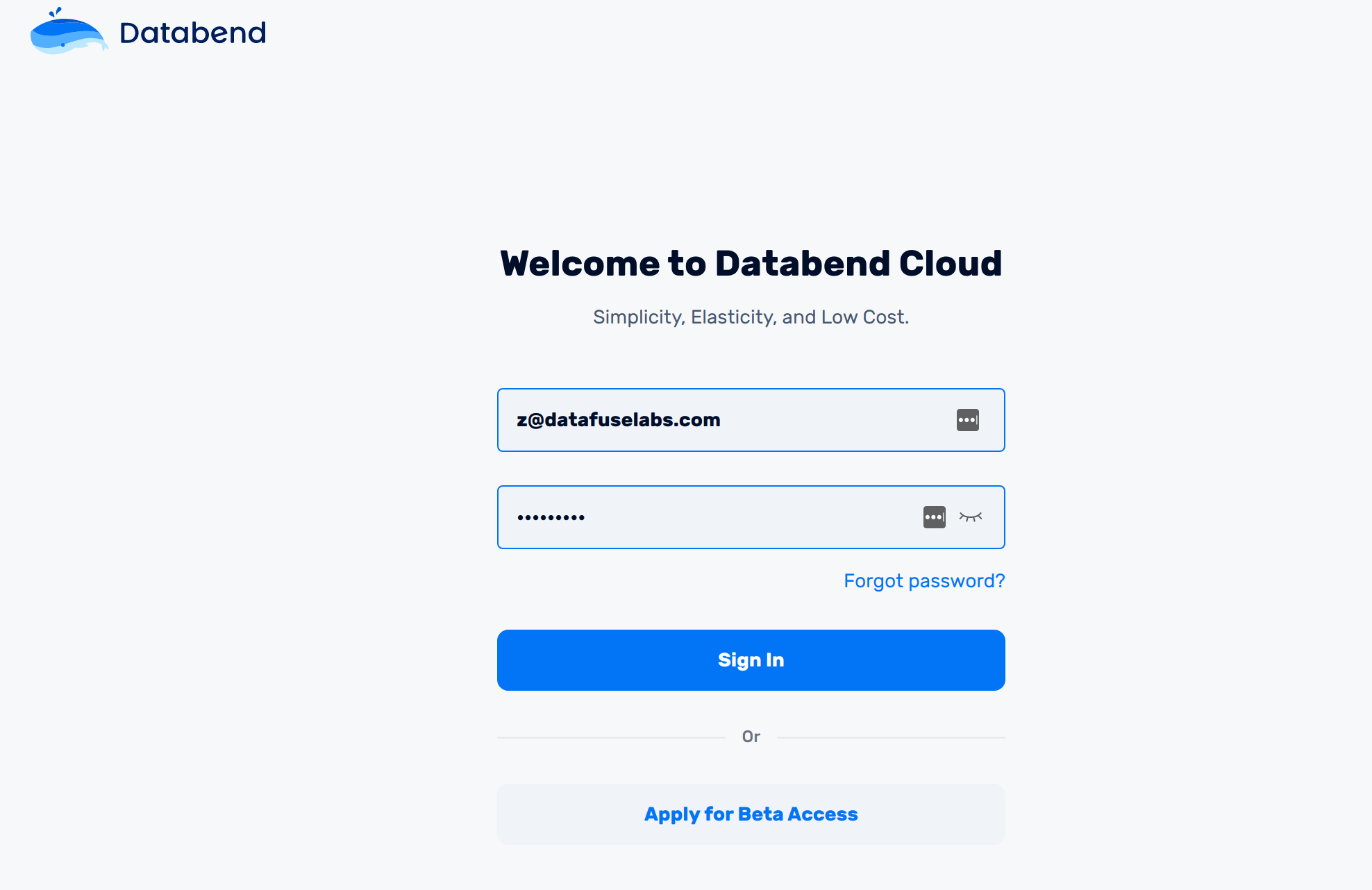 Databend Cloud is now in private beta. To create a Databend Cloud account, go to https://www.databend.com/apply to apply for beta access.