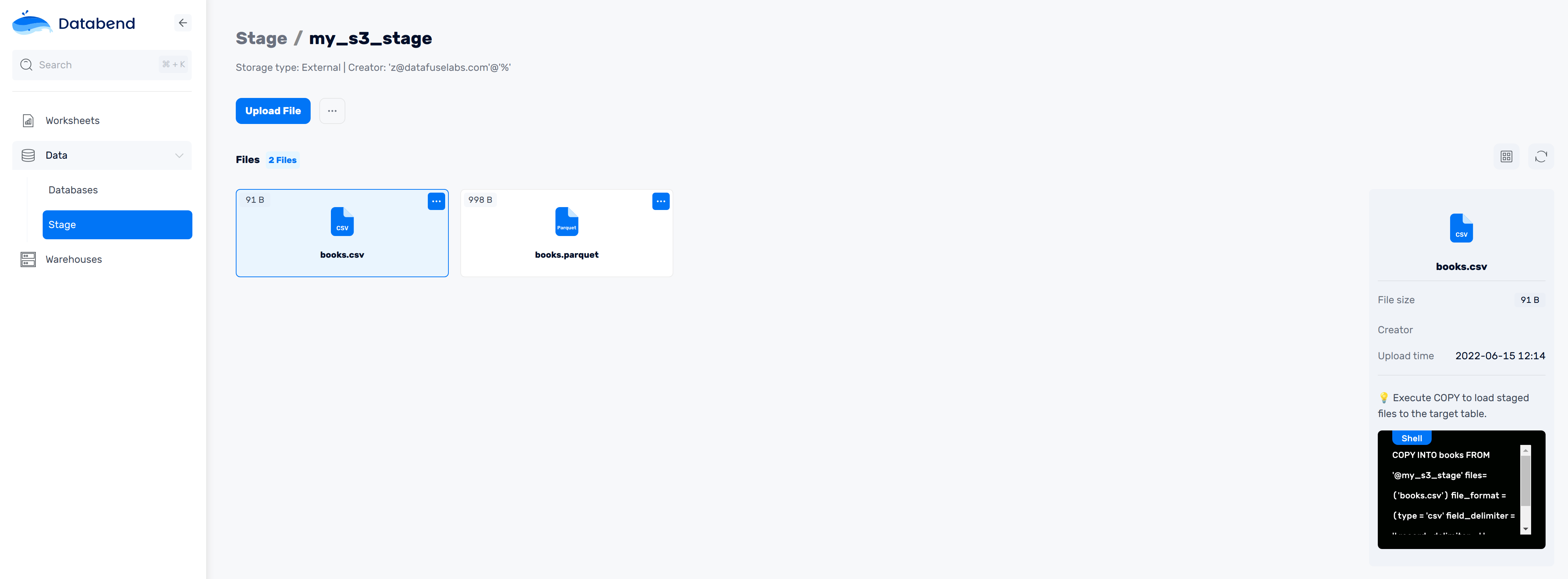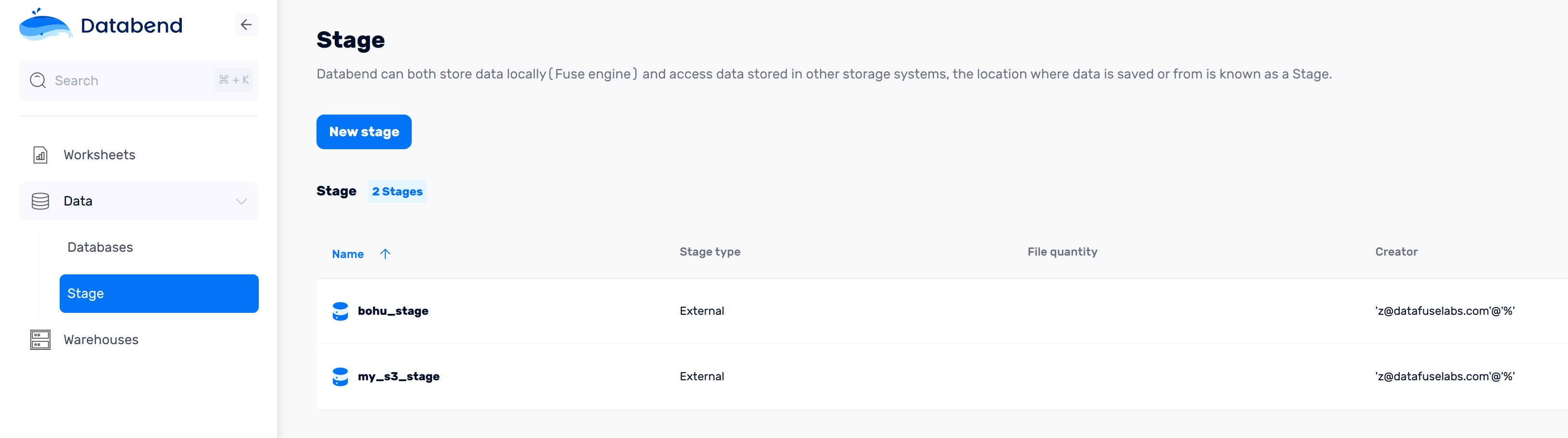The stage is the location where your data is stored. You can upload your local CSV, JSON, or Parquet files for data analytics.