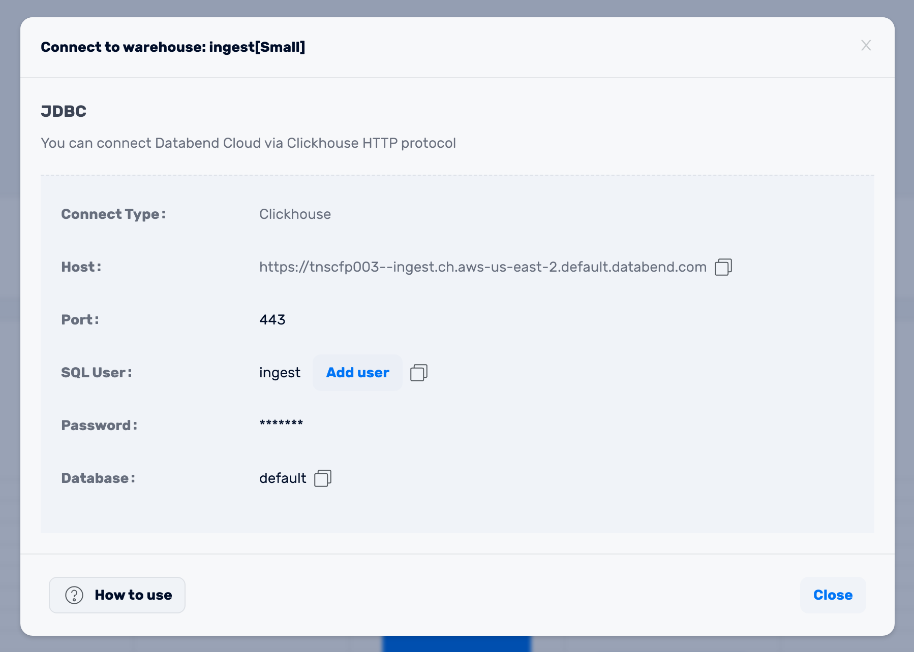 curl --header 'X-Clickhouse-User: <sql-user>' --header 'X-Clickhouse-Key: <sql-user-password>' https://<tenant>--<warehouse>.ch.aws-us-east-2.default.databend.com/?query=SELECT%201