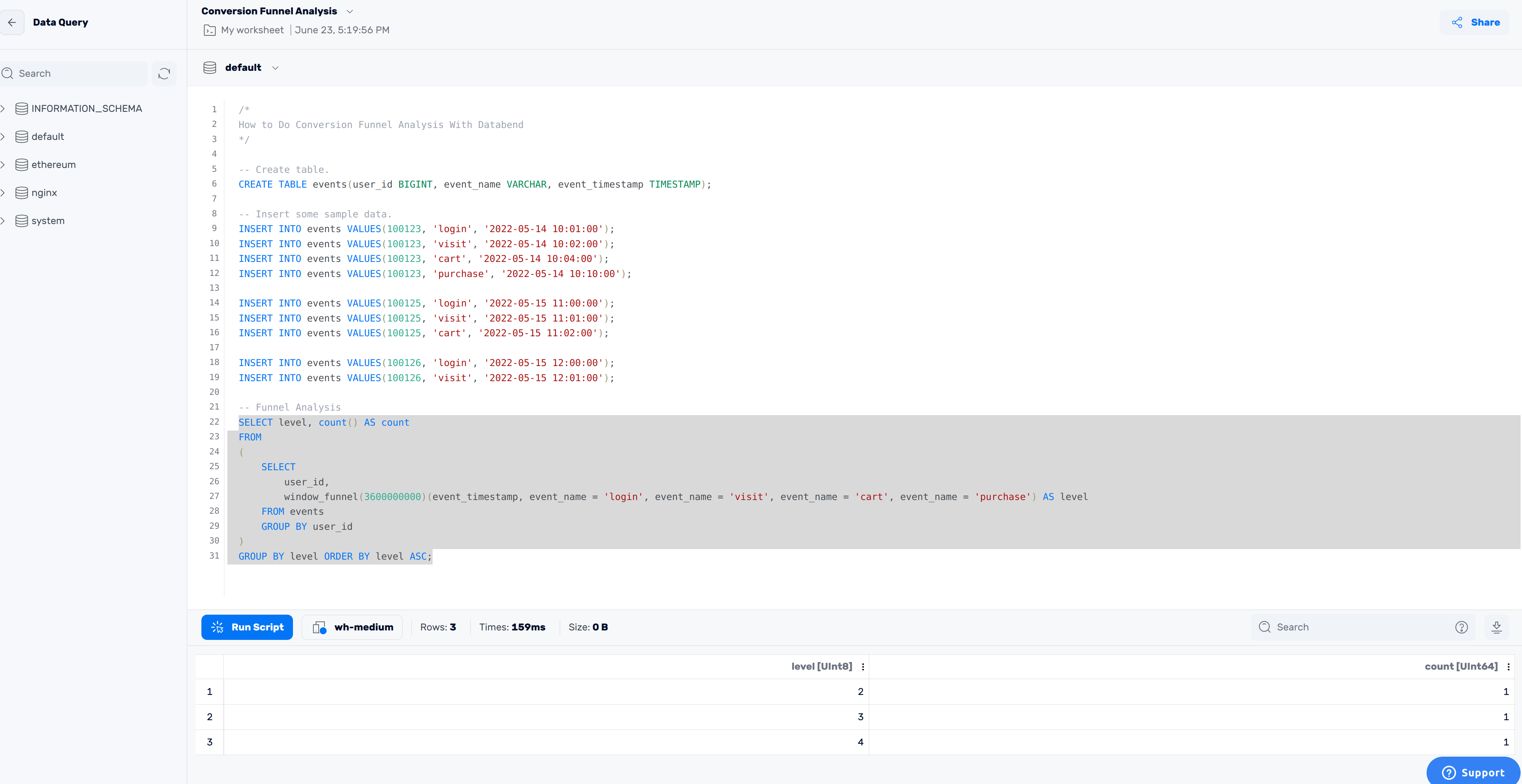 Worksheets is a powerful SQL editor where you can run SQL queries. For example, you can now do Conversion Funnel Analysis online.