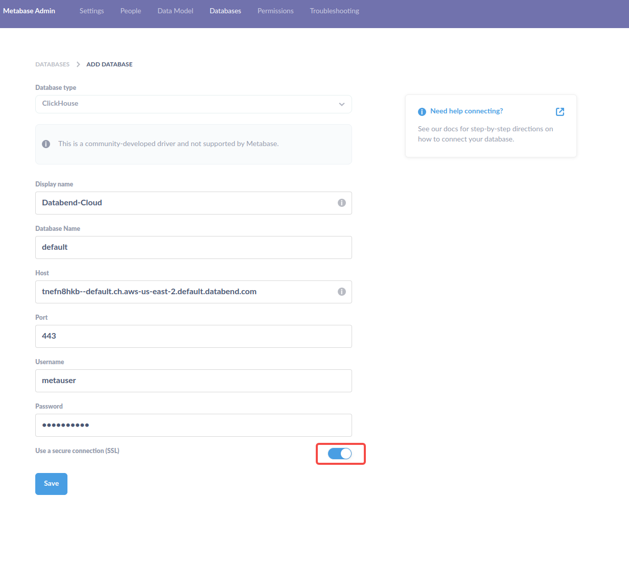 Because Databend is compatible with the ClickHouse protocol, we can use ClickHouse plugin to help Databend connect to Metabase.
