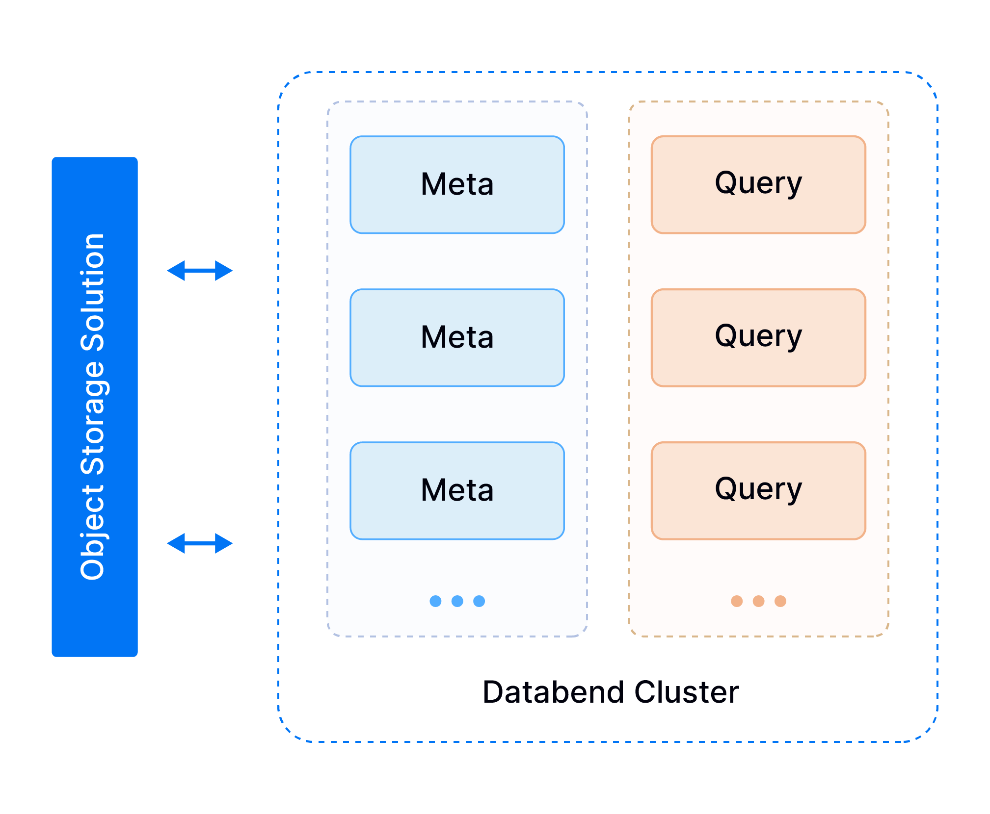 A Databend deployment includes two types of node, Meta and Query. The Meta node stores various types of metadata (such as database, table, cluster, and transaction) and manages user information (including authorization and authentication). The Query node takes care of queries.