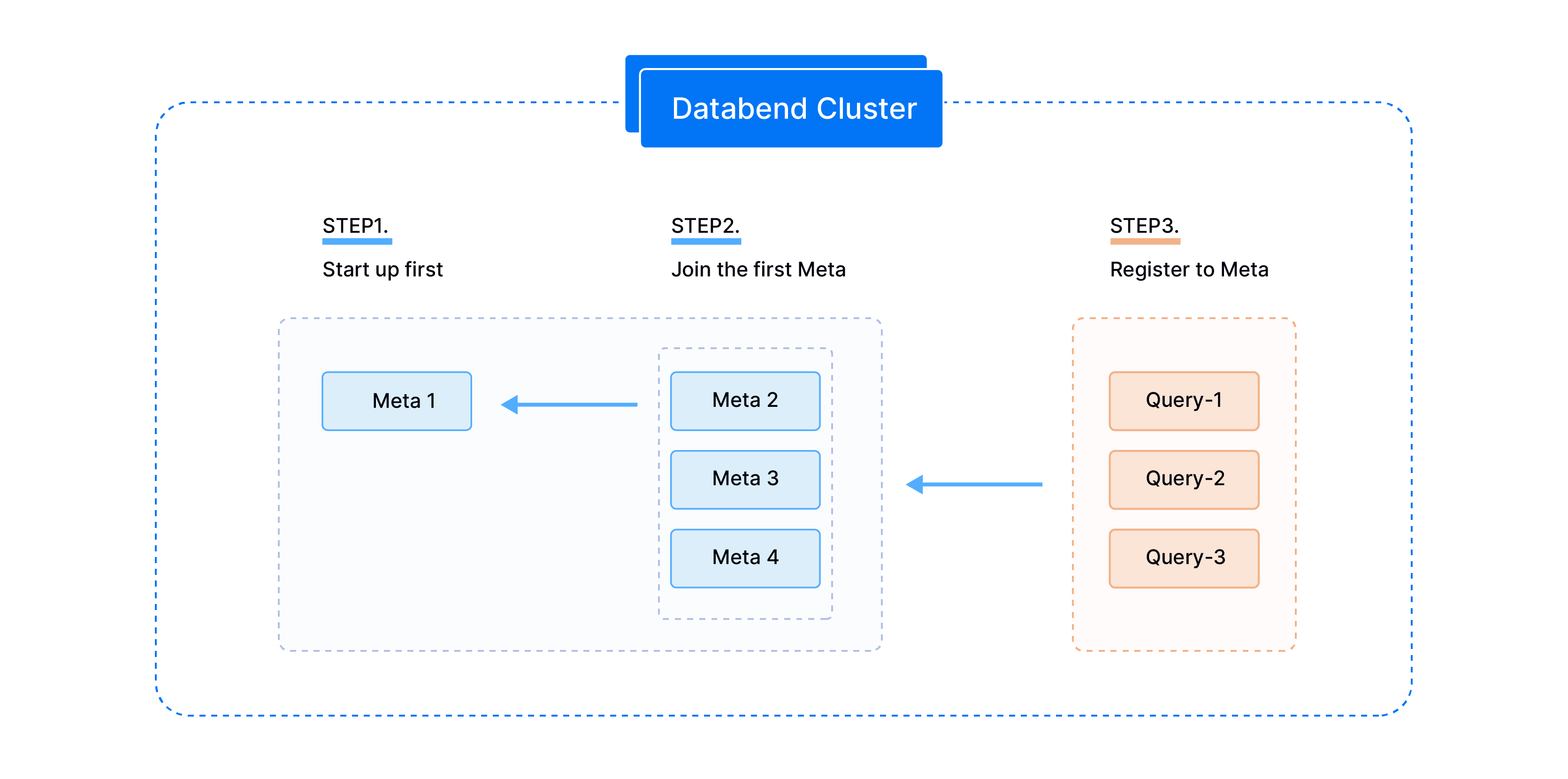 When you deploy Databend in cluster mode, you launch up a Meta node first, and then set up and start the other Meta nodes to join the first one. After all the Meta nodes are started successfully, start the Query nodes one by one. Each Query node automatically registers to the Meta nodes after startup to form a cluster.